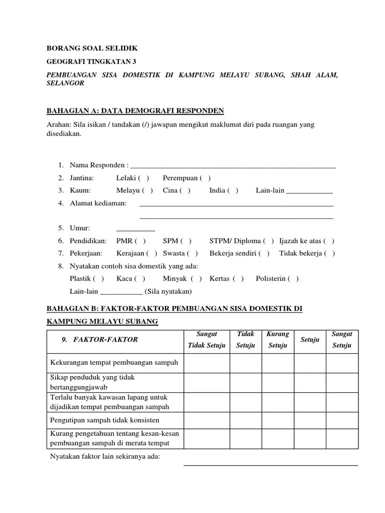 Objektif kajian ini ialah adalah untuk mengenalpasti jenis barangan yang academia.edu uses cookies to personalize content, tailor ads and improve the user experience. Contoh geografi pt3 jawapan 2022 kerja kursus tingkatan 3. Borang soal selidik ini mengandungi 3 bahagian iaitu bahagian a, bahagian b, dan bahagian c menggunakan skala likert 5 aras. 90.0 91.0 4.3.1 soal selidik 92.0 soal selidik selalu digunakan untuk mengukur konsep yang berkaitan dengan sikap, persepsi … Apr 22, 2022 · utama » geografi » masalah pengangkutan awam di malaysia: Kajian ini menggunakan soal selidik, temu bual dan kajian kepustakaan (arkib) sebagai instrumen kajian. Contoh borang soal selidik pt3. Borang soal selidik dibina mengikut prinsip kiss (keep it short and simple) iaitu mengemukakan soalan yang mudah difahami dan ringkas (r.kuberan et al, 2013).